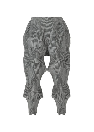 These pants are characterized by their pleated shape created using the Steam Stretch* technique arranged in a houndstooth pattern. They are soft like knitwear and have a loose fit that is moderately separated from the body. They are made from partially plant-derived polyester and recycled polyester thread.
