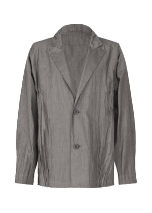 This jacket is from a series that applies to clothing design a technique in which three-dimensional items are folded completely flat. The jacket can be carried compactly by folding and storing it in the pocket inside the hem. It is characterized by its easy-to-fold, wrinkle-resistant textile adapted to the design.