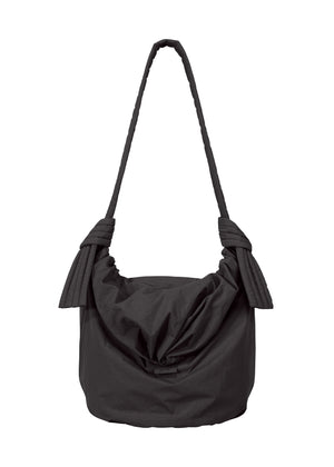 A shoulder bag featuring an appealing soft, light material and shape that makes you unconsciously want to touch it. It is made using a simple yet calculated method of twisting and sewing a rectangular piece of material, inspired by patterns that do not waste fabric used to make traditional Japanese noragi work clothing and monpe work pants. The zero-waste design utilizes even the smallest piece of fabric for parts.