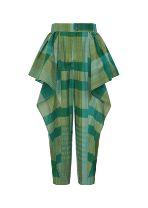 These pants are made from a very intricately-structured dobby weave seersucker fabric, achieved by using the shrinkage difference between cotton and polyester linen threads to create unevenness. The multi-colored threads in both the warp and weft intersect finely, resulting in a plaid pattern with depth that is reminiscent of a deep forest swamp.