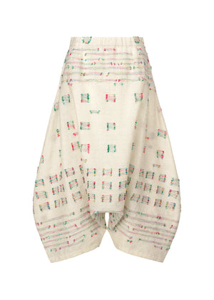 These sarouel-style pants are made with jacquard weaving inspired by sunlight filtering through trees. They have a soft texture and moderate tautness, and are made using linen for the warp and linen-polyester blend thread for the weft. The four-colored weft pattern threads are dyed using a Kasuri dyeing technique, and then cut while leaving fringes to create a more three-dimensional pattern.