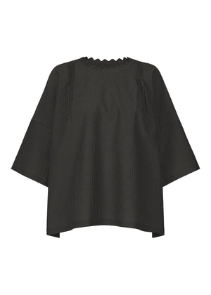 This short-sleeved top is made from light fabric with fine silk threads in the warp and stretch nylon and polyester threads in the weft, creating a delicate, uneven, three-dimensional feel. The checkered pattern is densely woven in Yamanashi, a historic textile production area. The top is characterized by its relaxed silhouette that brings out its lightness, and its pintucks and triangular embellishments.