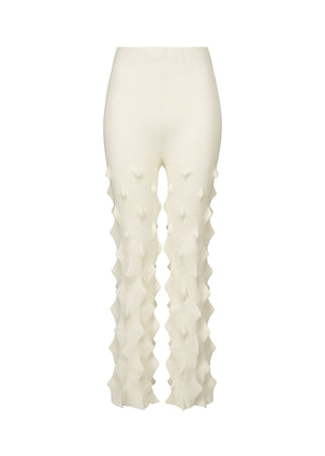 These pants feature a zigzag knit structure created using a special technique. They are made from blended yarn combining organic cotton and recycled polyester derived from plastic bottles.