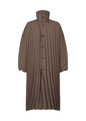 This long coat is made from highly-dense woven polyester material with a hand-pleated finish. It is characterized by its curved pleat lines, evoking a sense of the flow of wind. It has pockets on both sides and a center vent on the back.