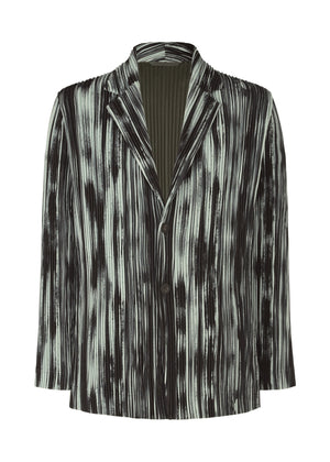 This jacket is characterized by its design inspired by the naturally unplanned stripe patterns of stone. You can enjoy the dignified jacket style made with material featuring a soft, supple texture despite being polyester. It has pockets on both sides, inner pockets, and a center vent at the back.