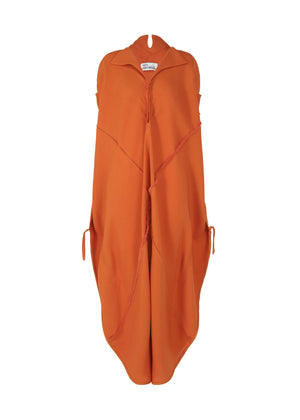 This jumpsuit is designed with quadrants as individual units that are arranged in a continuous circular shape. The design features a warp-less ribbon running through the center of the circle that creates a diagonal line across the body when worn.