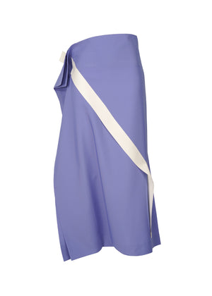 These pants feature a bold design with diagonal tape-like strips of fabric on the main quadrilateral fabric. The structure has draping created by the tape-like strips that run across the body when worn.