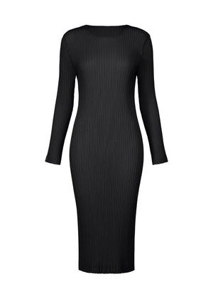 This pleated long-sleeved dress features the appearance of hatching, which looks like a scratched drawing. It is made from polyester with a textured finish that is dry to the touch. The texture is created by applying fine pleats twice.