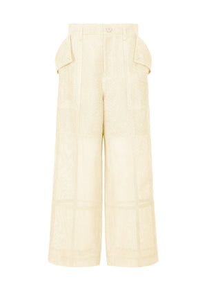 These straight pants are made from fabric with a unique texture, inspired by paper in ancient times made from the papyrus plant. The fabric is woven by intertwining thick cotton, ramie, and Japanese Washi paper threads, each dyed in subtly different tones, creating a moderate sheerness and rich color depth. They are characterized by their grid-like tape design that makes you sense a framework. The tape is applied to follow the body’s lines and functions as buttonholes.