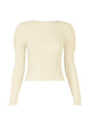This long-sleeved top gives a fresh impression with its random pleat lines. After adding box pleats, a Majolica pleating process was applied, resulting in new pleat lines unlike any other. Despite being 100% polyester, the base fabric has a cotton-like texture and gives a different impression from the standard pleated tops.