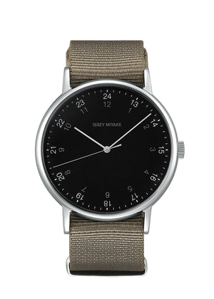 The "AM face" and "PM face," which are the two faces representing a day, are expressed on the watches' dials. The "AM face" has a crisp, white finish and clearly outlines the numbers 1 to 12, while the "PM face" is finished in a bold black, with the primary numbers of 13 to 24 giving it a more active nuance. The concentric circle pattern on the dial makes the numbers stand out when viewed at an angle and adds depth to the expression of each face. This model is in a new color that softly reflects light.