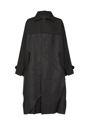 A coat that features a contrast between matte, flat areas and shiny, randomly wrinkled areas. The other parts are folded randomly to fit inside the flat upper body, and the shape is created by pressing.