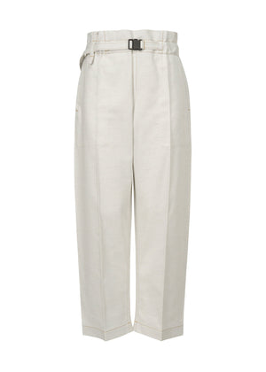 These denim pants are made using thread newly created from the scraps and leftover pieces of STRETCH PLEATS fabric produced in the clothes-making process, which are made back into cotton using reclaimed wool technology and mixed with recycled polyester. The pants are from an eco-friendly series created based on the idea of treasuring fabric. The functional design allows the pants to be folded along the pleats to make them compact and easy to carry. There are pockets on both sides.