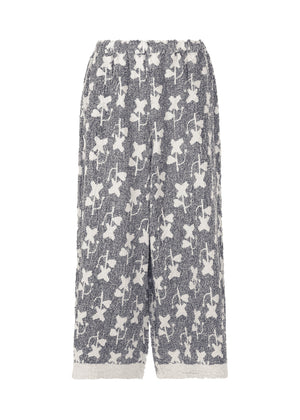 These CAULIFLOWER wide pants are characterized by the feel of their material that has the excellent comfort unique to cotton as well as a stretchy unevenness. The design uses pigment printing to express a denim texture, and makes it look like the flower silhouettes from the "OHANA" series are emerging. The pants have pockets on both sides.