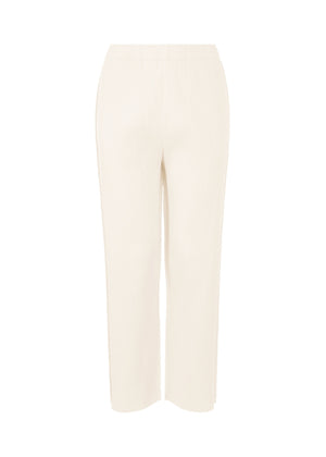 These fine knit, pleated, straight pants are characterized by their lightweight, soft feel and feature pleats applied to knit material made with stretchy, thin, soft yarn. There are pockets on both sides.