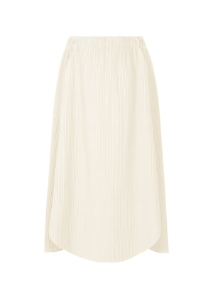 This FINE KNIT PLEATS skirt is characterized by its lightweight, soft feel and features pleats applied to knit material made with stretchy, thin, soft yarn. The design resembling four clover leaves joined together creates a moderate voluminous feel and a three-dimensional silhouette.