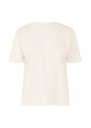 This fine knit, pleated, round-neck, short-sleeved top is characterized by its lightweight, soft feel and features pleats applied to knit material made with stretchy, thin, soft yarn.
