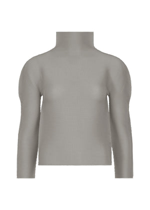 This STRETCH PLEATS high-neck, long-sleeved stretchy top features vertical and horizontal pleats.