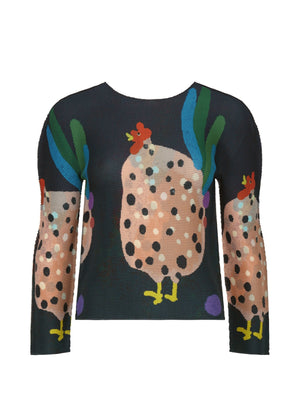 This STRETCH PLEATS round-neck, long-sleeved stretchy top features vertical and horizontal pleats. This pattern features a chicken heralding the start of the day.