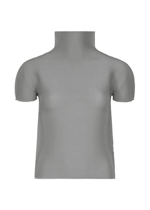 This high-neck, short-sleeved top features vertical and horizontal stretch pleats.