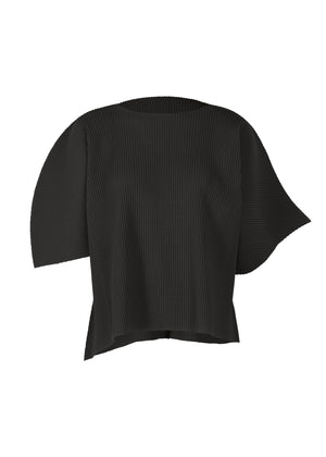 This FINE KNIT PLEATS short-sleeved top is characterized by its lightweight, soft feel and features pleats applied to knit material made with stretchy, thin, soft yarn. The form expresses the look of plants growing and extending freely in all directions, creating a simple yet bold asymmetrical design based on a basic style.