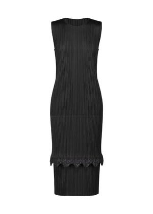 This round-neck, sleeveless dress is characterized by its process that involves simultaneously conducting cutting, sealing, and foil transfer. After this simultaneous treatment, the hem fabric is folded inward and pleated to create an airy silhouette.