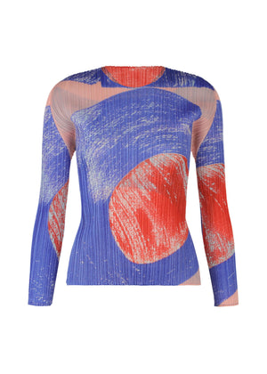 A long-sleeve top with a dynamic curved print using paper printing techniques.