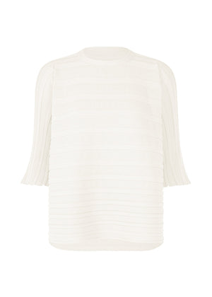 This round-neck knit with 3/4 sleeves is characterized by its uneven, thick border lines. It is available in vivid colors, and is recommended to be styled in outfits with pleated items.