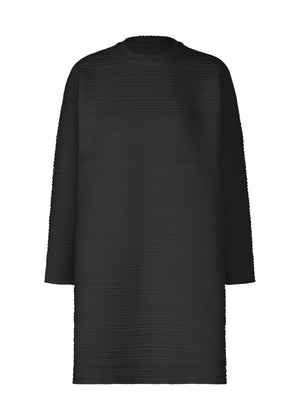 This round-neck, long-sleeved tunic features pleats in a horizontal knitting structure. It is characterized by being easy to care for as it is lightweight and machine-washable due to being made from 100% recycled polyester.