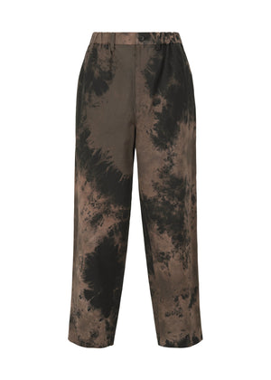 These pants are characterized by textiles made using discharge printing and dyeing techniques. A unique pattern is created by layering fabrics of the base color in a dynamic and complex manner and performing discharge printing and dyeing in this state. The pattern of this product is different one by one. Thank you for your understanding in advance.